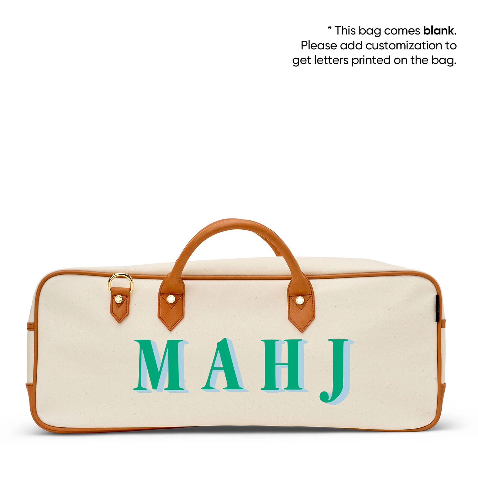 PERSONALIZATION: Comes in Mint and Sky serif letters. Up to 4 letters max. No Symbols. English characters only. [CLASSIC SHADOW] The stylish way to store and carry your mahjong tiles, racks and accessories. Made of a durable canvas and vegan accents. The Margo comes with a zippered bag for your tiles and a drawstring bag for racks. Features Stain and water resistant coated canvas Zippered storage bag for tiles Drawstring storage bag for racks Removable shoulder strap Product Care Please avoid contact with dyed fabrics and printed materials to prevent color transfer to leather, and please do not dry clean. Dark colored jeans can cause staining on canvas. If crocking should occur, wipe immediately with a "Magic Eraser" type cleaning product.