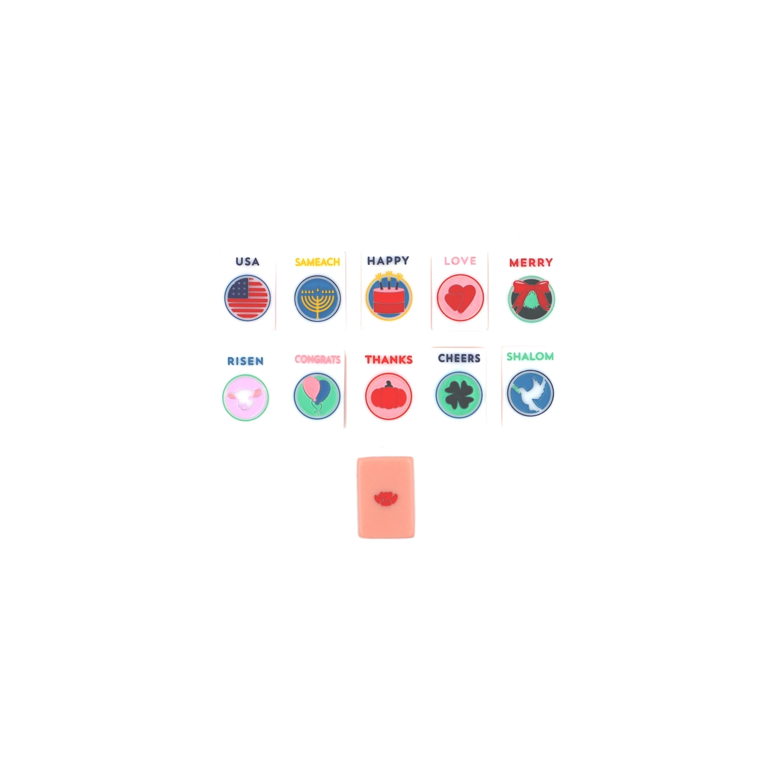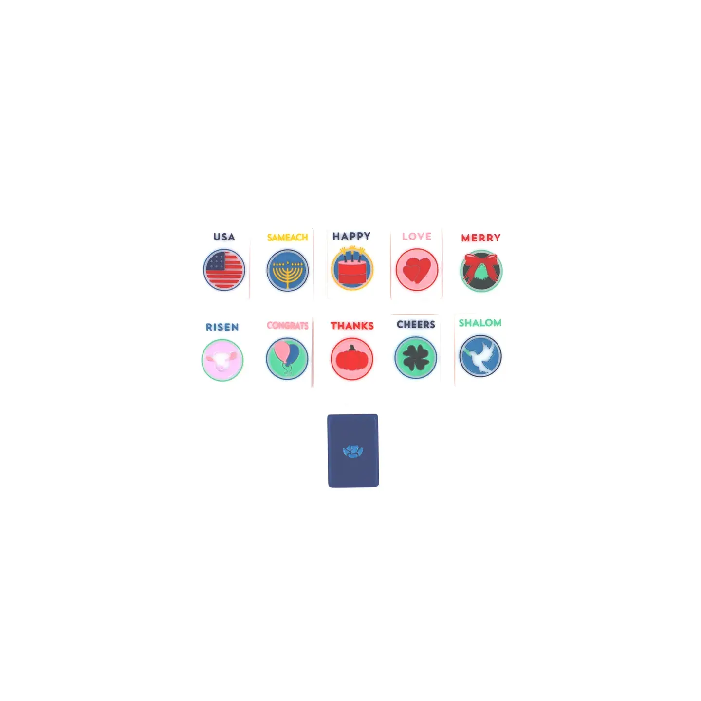 This special set includes 80 uniquely designed jokers, celebrating 10 of our favorite holidays and festive sentiments. The perfect addition to your House Tile Set, swap these in for your regular jokers to add a festive touch and make holiday games even more memorable. T